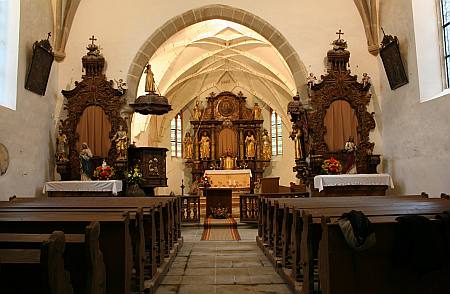 Pøední strana kostela s presbytáøem a postranními oltáøi / Der vordere Teil der Kirche mit dem Presbyterium und den Seitenaltären